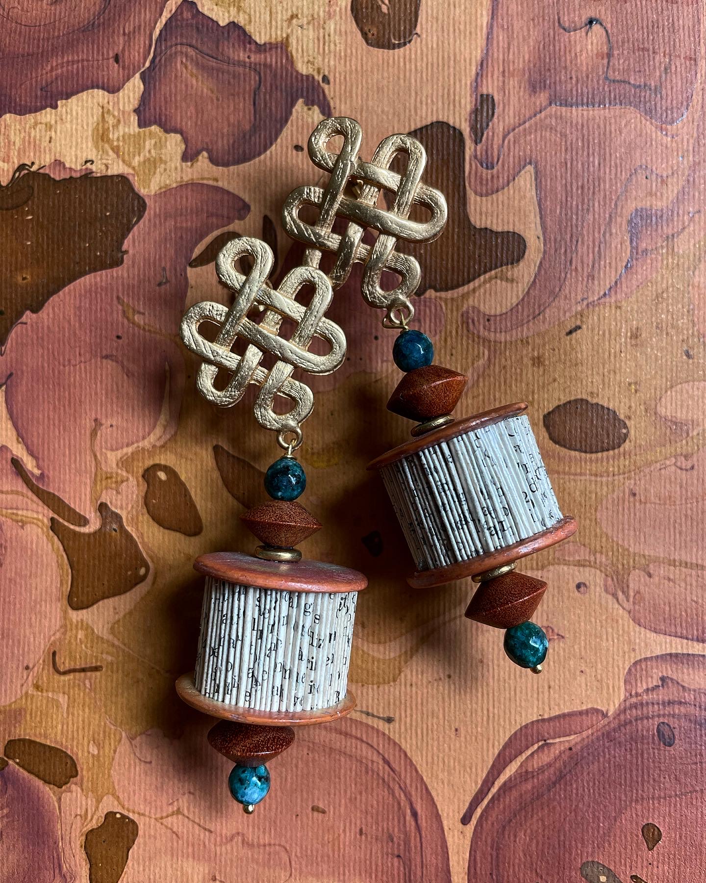 Hand made paper jewelry combined with richly decorated gold galvanized zamak ear piece with decorative bead and brass elements to finish off.