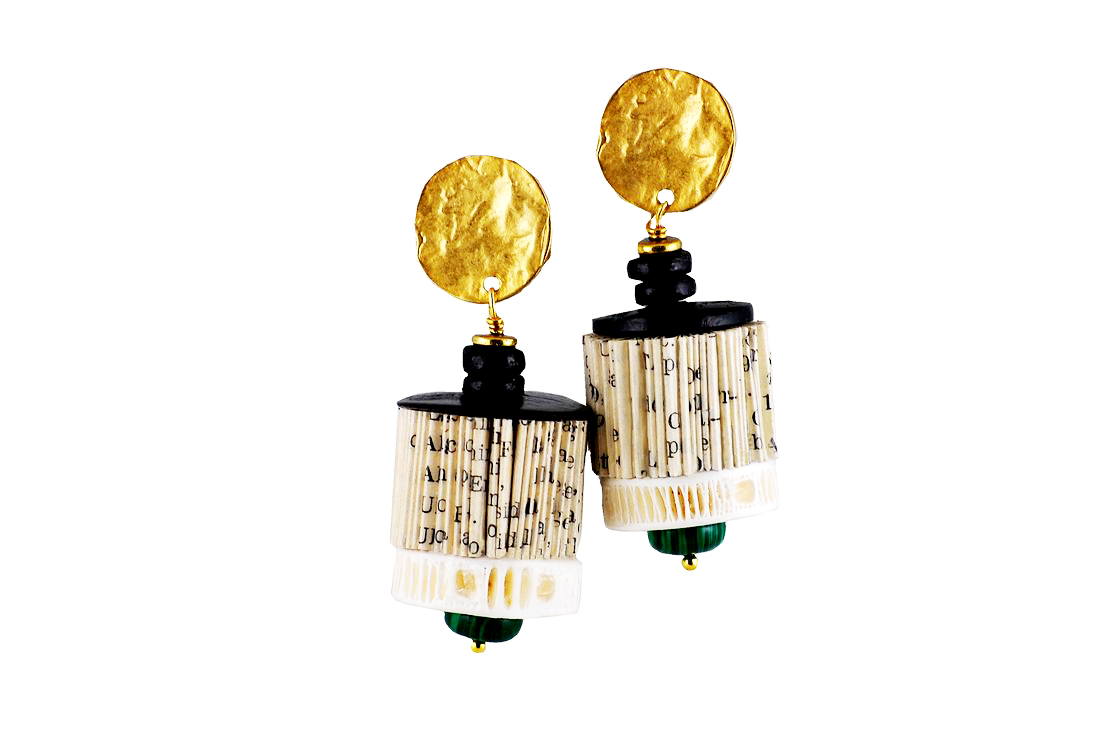 Hand made paper jewelry combined with round shaped gold galvanized zamak ear piece, off white bone, black wooden disks and beads, green malachite and brass elements. All earrings are nickel free.
