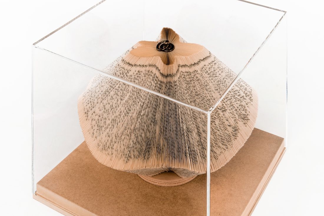 Hand folded old books; wood; brass ring