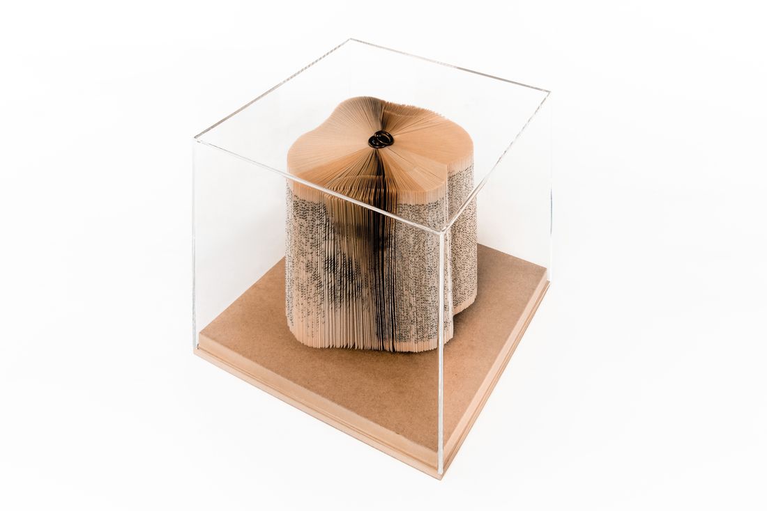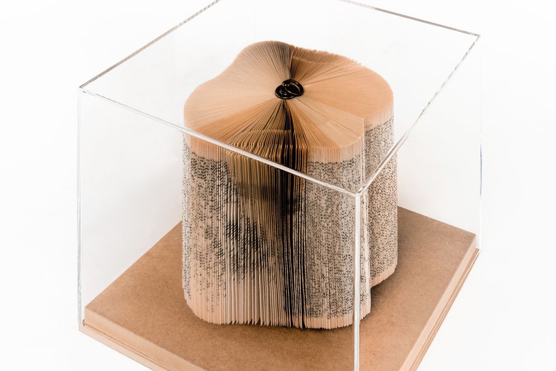 Hand folded old books; wood; brass ring