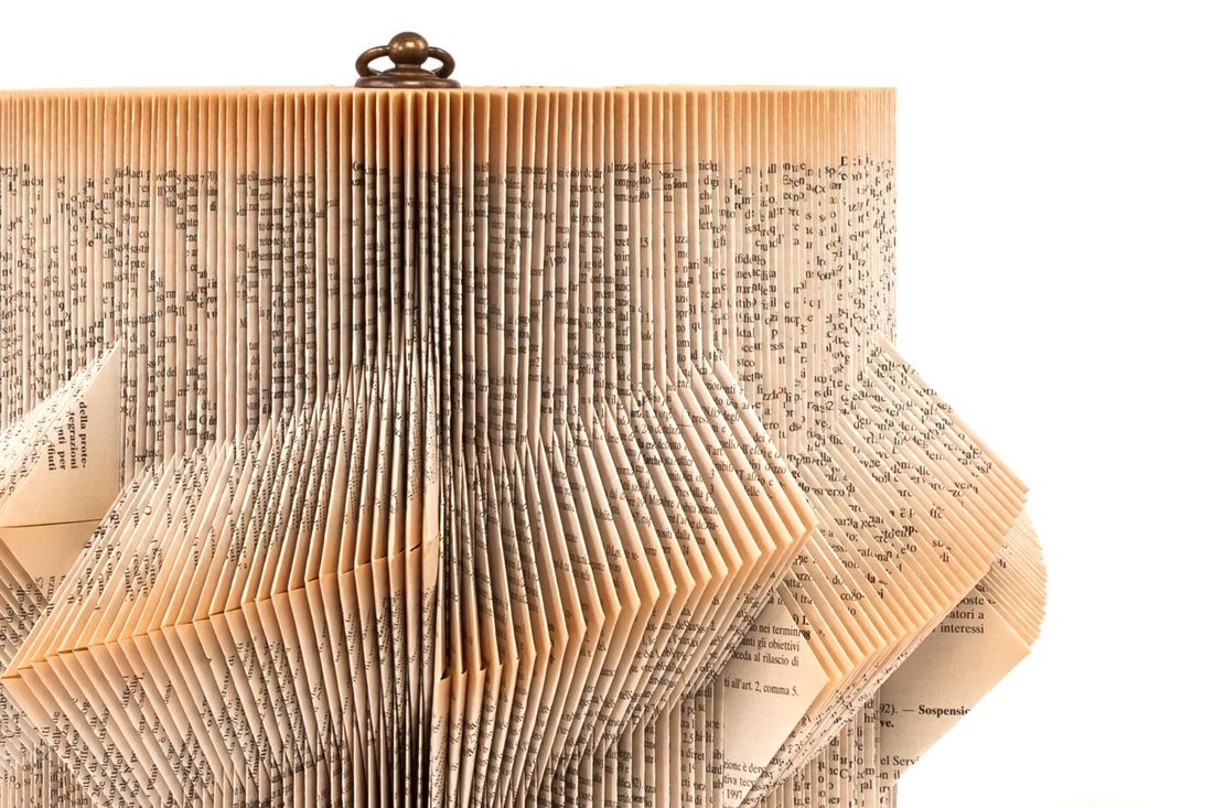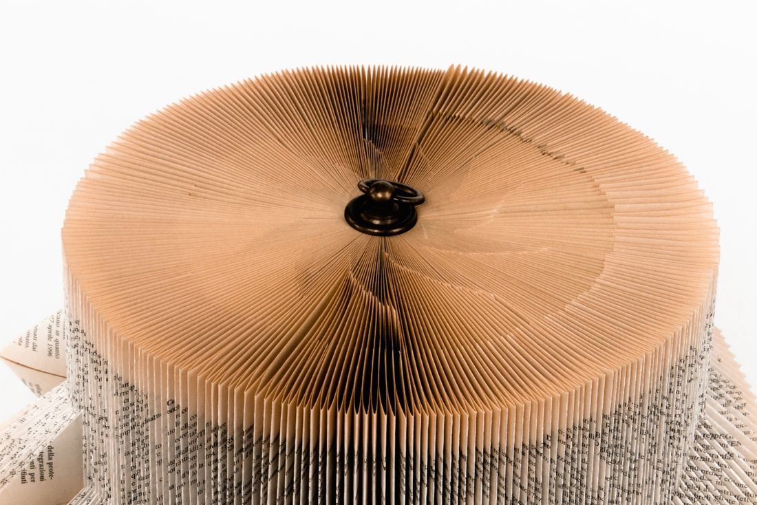 Hand folded old books; wood; brass ring