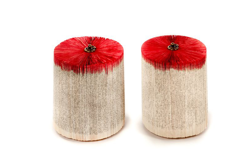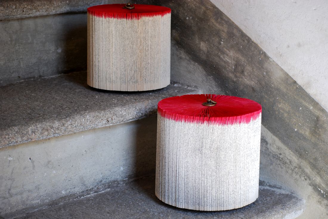 Hand folded old books; wood; brass ring; natural pigment